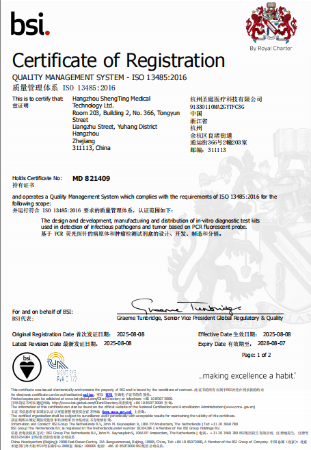 圣庭医疗始终坚持“不断创新,始于对生命的承诺”,此次认证不是终点,而是新的起点。圣庭医疗在全国8个城市建立实验室和1个GMP生产车间,销售网络遍布全国市场,已与东南亚、南亚和西亚等地区多个国家建立深度的业务合作,圣庭医疗将继续优化质量管理体系,推动产品的迭代与升级,以更高的标准服务医疗健康事业,为行业高质量发展贡献力量!